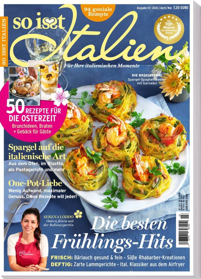 Erlebe mit der neuen Ausgabe von „So isst Italien” die köstlichsten Seiten des Frühlings! Freue dich auf saisonale Spargelrezepte, fruchtige Rhabarberdesserts, festliche Ideen für Ostern und unkomplizierte One-Pot-Gerichte für den Alltag. Ob genussvoller Osterbrunch, zartes Lamm für die Feiertage oder schnelle Blitzrezepte – dieses Heft vereint italienische Leichtigkeit mit saisonaler Vielfalt und alltagstauglicher Küche.