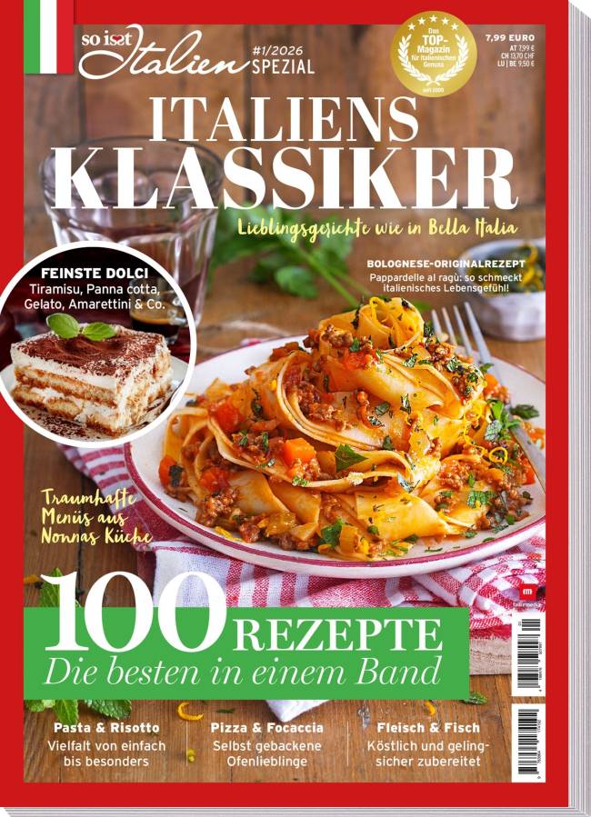 Entdecke mit dem „So isst Italien”-Sonderheft die 100 besten Rezepte der italienischen Küche – authentisch, abwechslungsreich und gelingsicher. Wir präsentieren ikonische Klassiker von Pasta, Pizza, Gnocchi und Risotto bis zu Fisch- und Fleischgerichten, liefern harmonisch abgestimmte Vorspeisen, Aperitifs und Dolci für komplette Menüs und geben kompaktes Basiswissen zu Zutaten, Techniken und Vorrat, damit es zu Hause wie in Italien schmeckt.